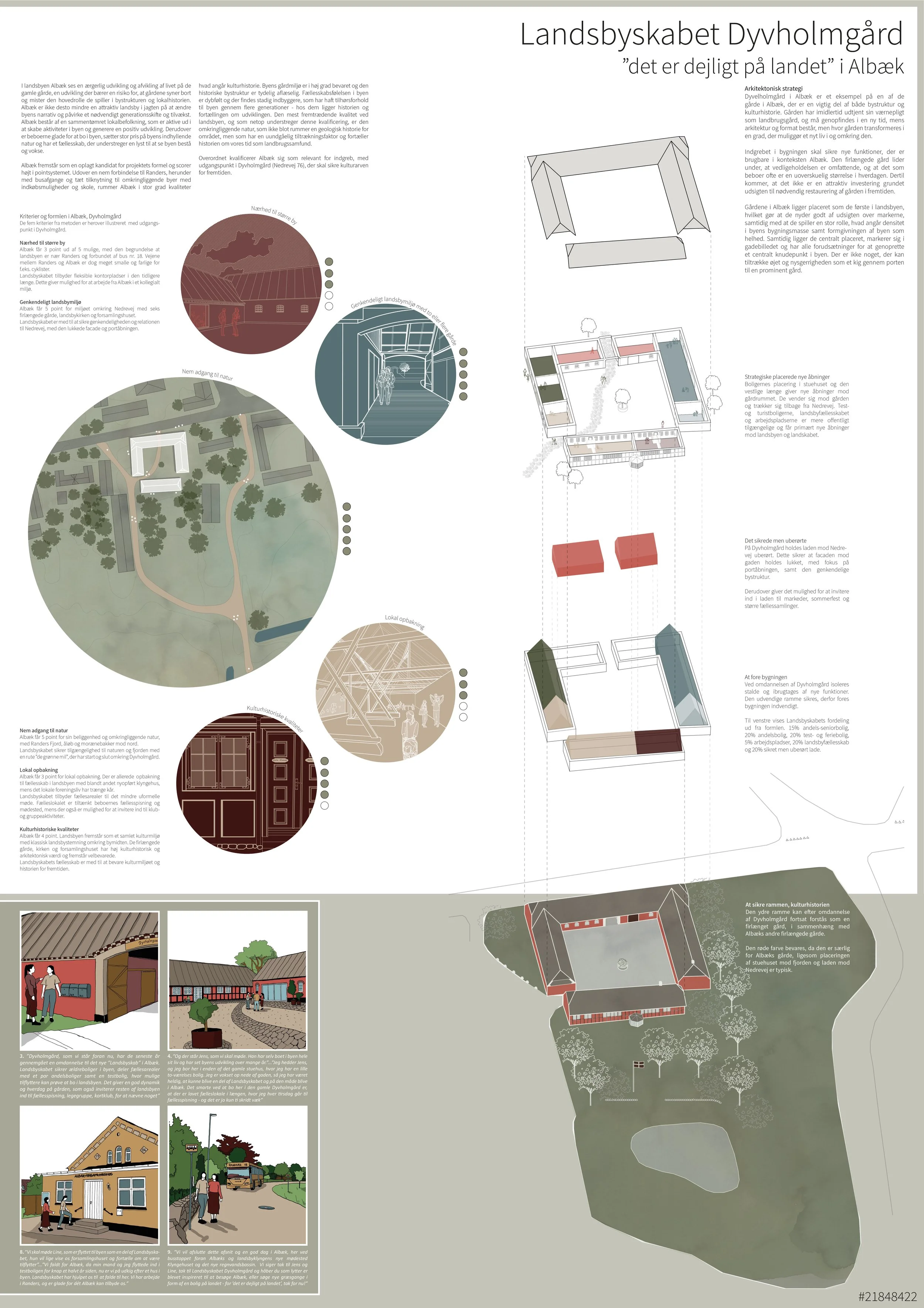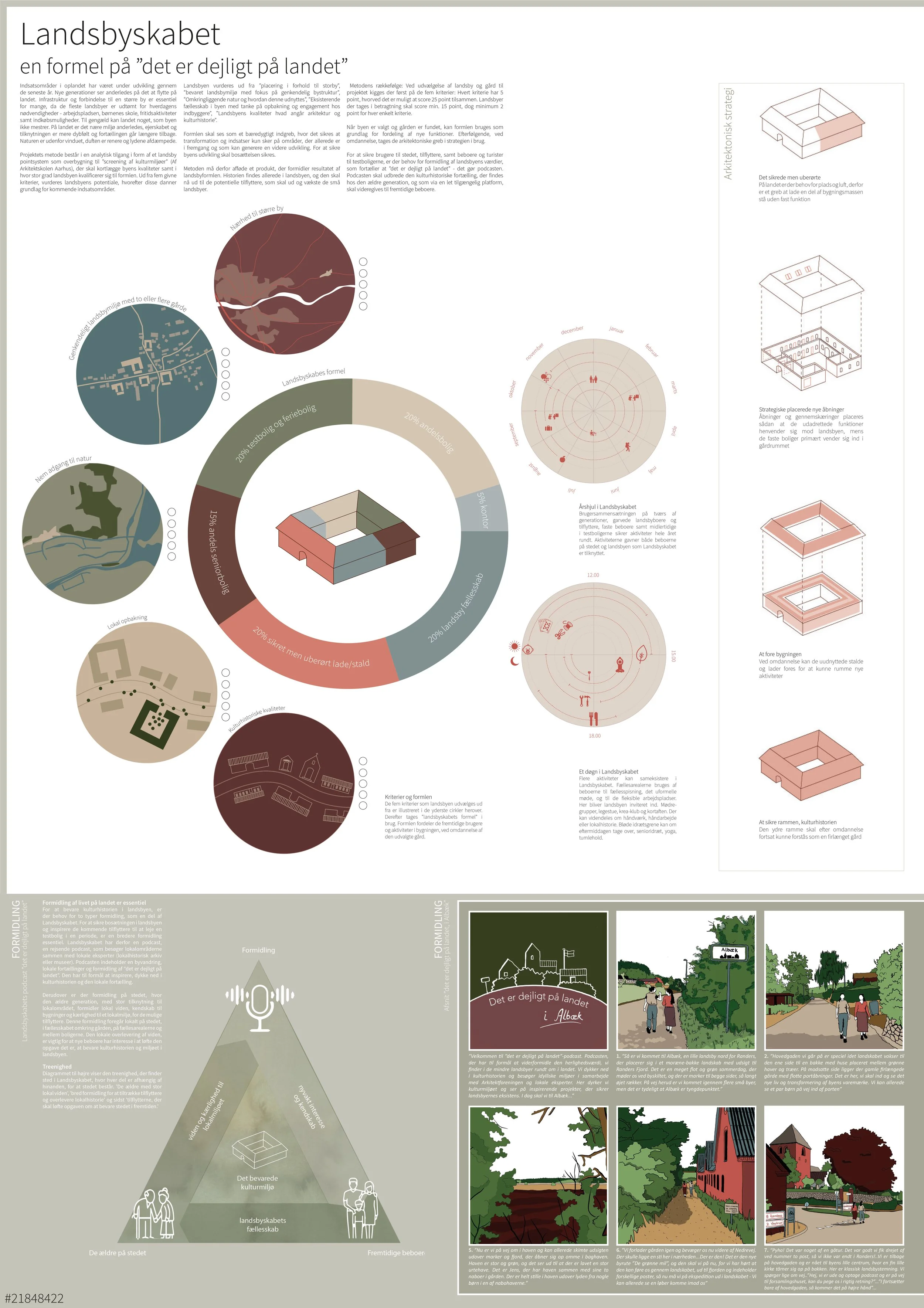 Projektet tager udgangspunkt i landsbyen Albæk øst for Randers. Landsbyen består af flere firelængede gårde langs hovedgaden, tydelige kulturhistoriske kvaliteter og desværre en afvikling der gør, at landsbyens beboere bliver ældre og færre. ’Landsbyskabet’ byder ind med et redskab, en metode, for kommuner der kan vurdere hvilke landsbyer der har potentiale for udvikling. Formlen vurderer på flere parametre som er vigtige, for at tiltrække nye beboere. Blandt andet ’nærhed til større by’, ’kulturhistoriske værdier’, ’lokal opbakning’ og ’adgang til natur’. Herefter viser projektet hvordan man med enkle arkitektoniske greb kan omdanne og sikrer de kulturhistoriske gårde. Derudover ligger projektet vægt på formidlingen af ’det er dejligt på landet’ – varen skal sælges, sådan som livet i nybyggede forstæder sælges.